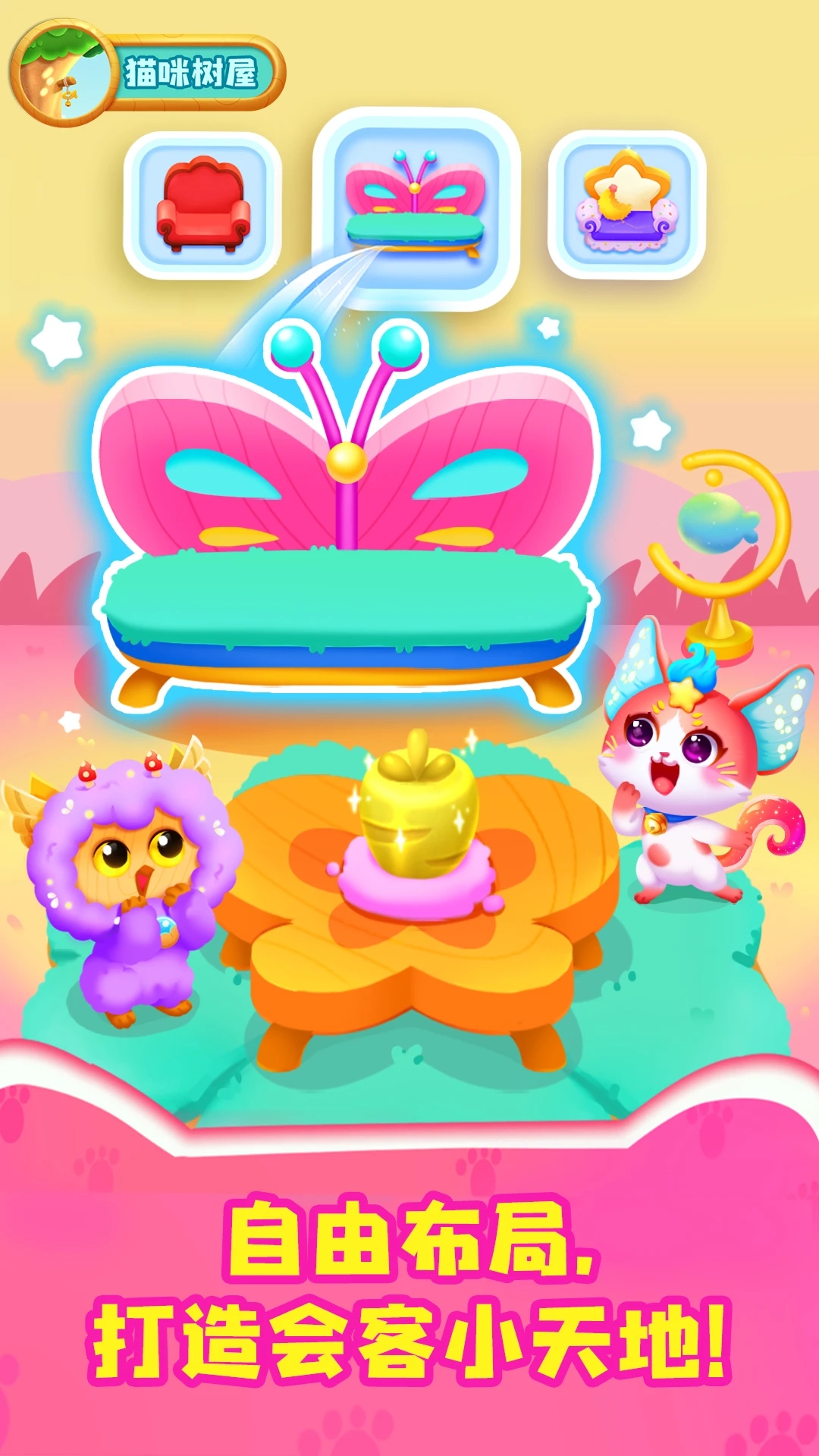 新区域——会客厅上线!猫精灵准备邀请户外世界的小伙伴前来做客,宝宝帮忙布置一番:贴上绿色系墙纸,再添置蝴蝶造型沙发、花朵状置物台……营造如置身森林般的氛围!对了,星空探秘活动开放啦,宝宝快带猫精灵一起观星空、连星座!