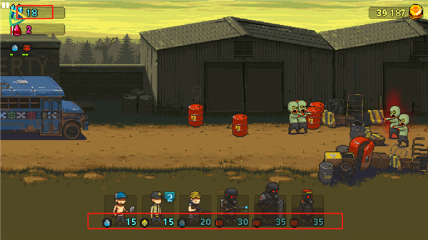 进入游戏后点击战斗”开始你的第一场防御战。左上角显示的勇气点”是部署单位的核心资源,开局即以每秒1点的速度持续增长。不同单位消耗的勇气点数不同,需根据当前僵尸阵容合理选择出战角色。战斗中击杀僵尸会随机掉落额外勇气点,点击即可收集,加速部署更多战力。