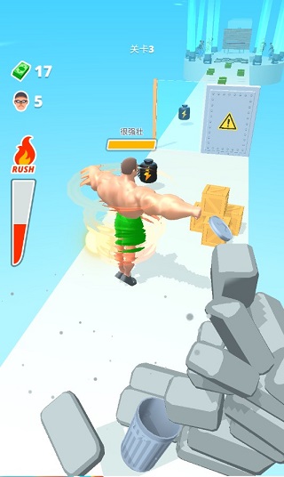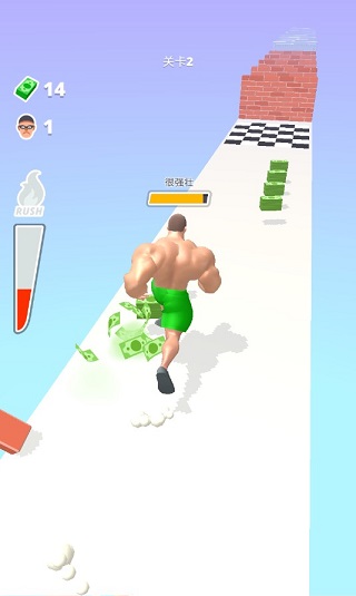 玩家将操控一位不断壮大的肌肉男,在赛道上左右滑动进行移动。途中需尽可能收集散落的电池能量块,用以提升角色的力量值——力量越强,越能一拳击穿厚重墙壁,顺利推进关卡进程。同时,道路上还分布着钞票等资源,助你积累财富,解锁更多内容。