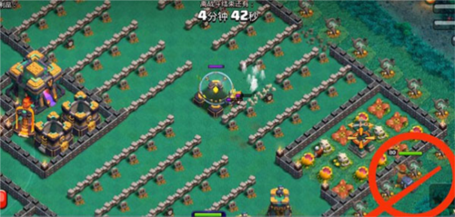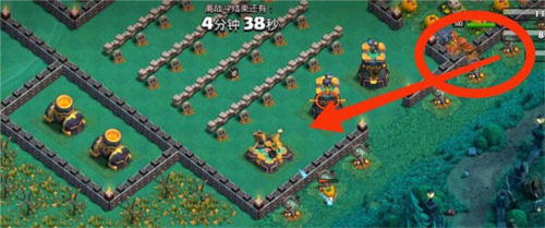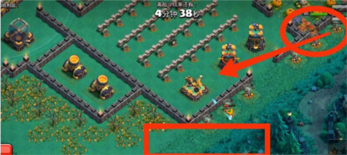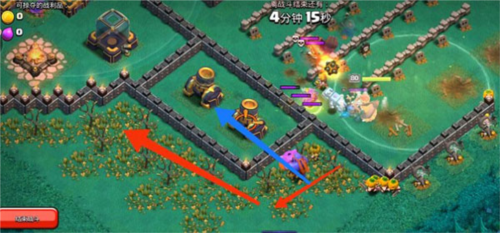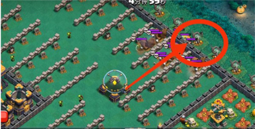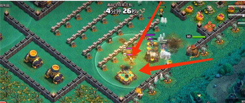 2、待女武神接近圣水罐后,在下方建筑工人小屋旁部署弓箭女皇,引导其依次摧毁小屋、炸弹塔与X弩,此时女武神处于安全范围,可保持良好状态。