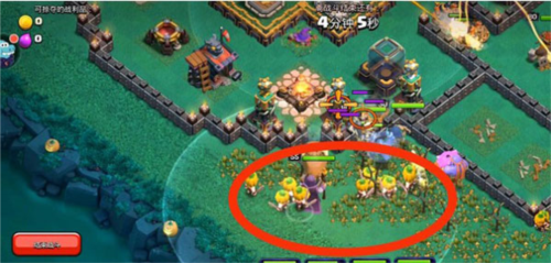 1、在右侧红圈区域部署2名女武神,利用其自动破墙特性直取圣水罐。务必确保女武神未被皇家幽灵攻击,否则建议重开以保血量。