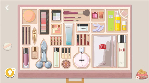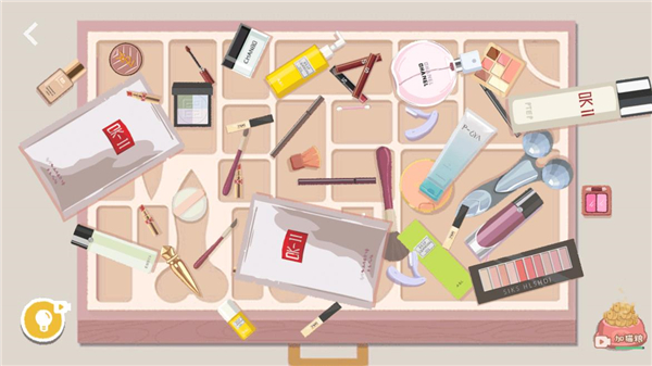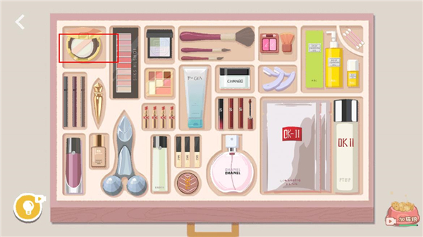 3、当所有化妆品归位后,发现粉扑没有合适的位置,点击粉饼盒子打开。