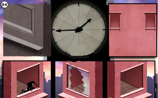 需同步处理多个变量:先按图示排列格子,再调整大时钟时间;后续还需利用窗户破碎的时机击倒警察,操作环环相扣。