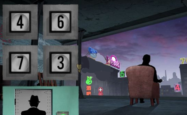 本章新增电梯密码锁机制。线索隐藏在右侧霓虹灯的闪烁顺序中,正确密码为4673,需仔细观察环境细节。