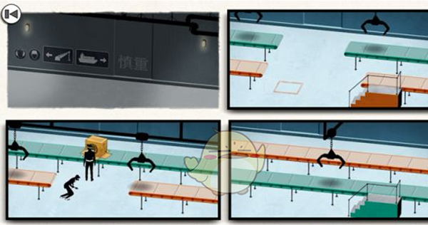 第三步:人物迅速进入已落下的纸箱,连人带箱一同进入绿色传送带,完成最终脱身。