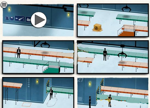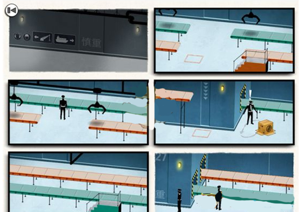 第二步:确保箱子移至红色传送带,人物走上绿色传送带。如此,箱子将在第五格落下,人物则从警察背后绿色传送带走出,成功避开视线。
