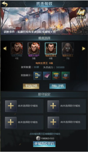 抗击匈奴:由联盟盟主或副盟主发起,每日限一次。成员可派兵守城或直击匈奴大营。每支部队最多连续击败3波守军,摧毁大营可视为清除所有剩余敌军。奖励包括防守城主专属奖励、个人积分奖励及全盟共享的联盟积分奖励,抵御波数越多,收获越丰!