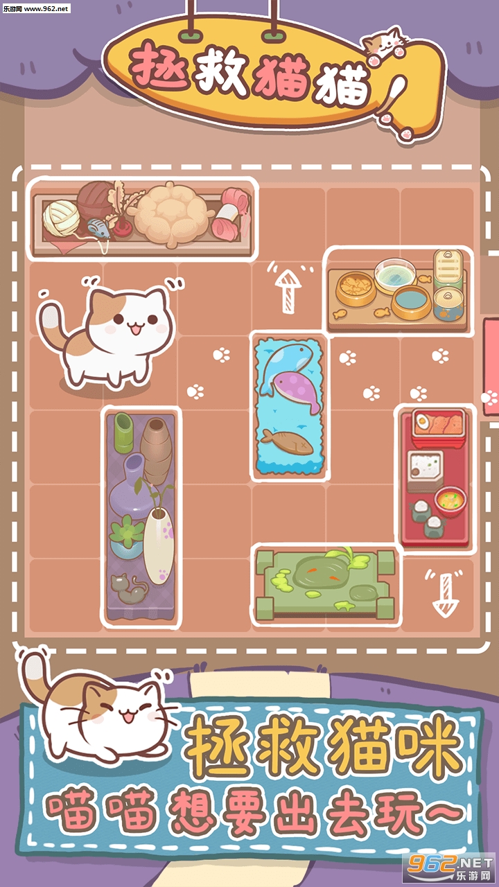 超简单的华容道玩法,比较障碍物的长度和方向,帮助小猫咪顺利脱险。