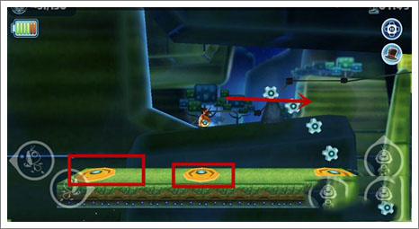 5、到这里要先让圆桶掉进左边的凹槽,然后中间圆盘会转动,跳到圆盘上面吃掉齿轮,到对面过去。