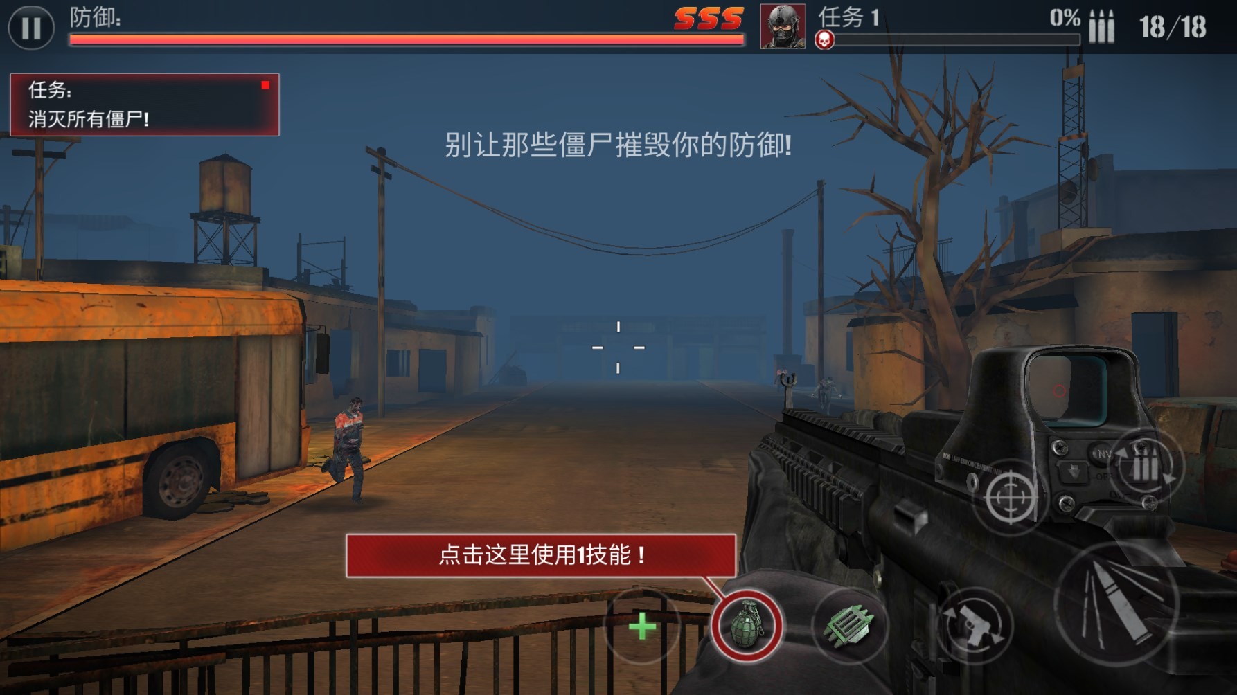 4、接下来,拿起你的武器,瞄准并射杀那些逼近的僵尸,确保它们无法靠近。
