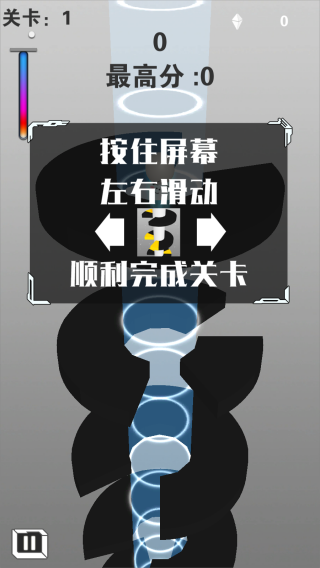 2、左右,玩家按住中心轴左右摇摆进行控制,每个黑色物体之前都空隙,你要做的就是让小球从空隙中通过,通过一个空隙加1分,通过2个或2个以上的空隙分数加倍。