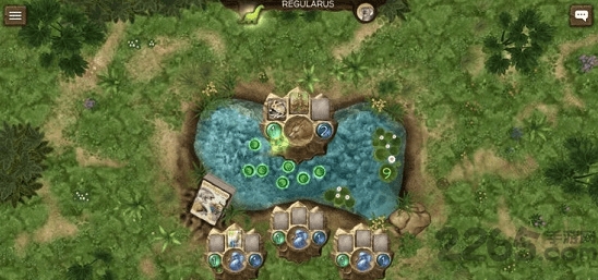 3.玩法上游戏采用卡牌对战的模式,玩家需要控制自己的远古生物,通过从对手手里抢夺各种食物,让它们不断地进化,最终取得对战的胜利;
