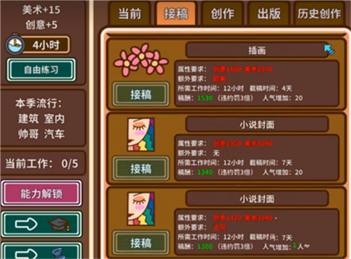 游戏初期,玩家需在画师”与写手”两条路线中做出选择,这将决定后续可接任务类型与所需属性方向。由于连载门槛较高,前期主要依靠接取零散稿件维持生计。每份稿件都有明确的属性要求(如创意1000、美术1100)和截稿时间,不达标则无法承接。