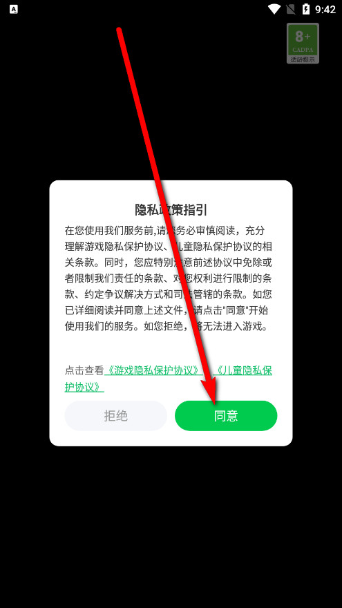 1、仔细阅读游戏内置隐私政策指引,点选【同意】进入。