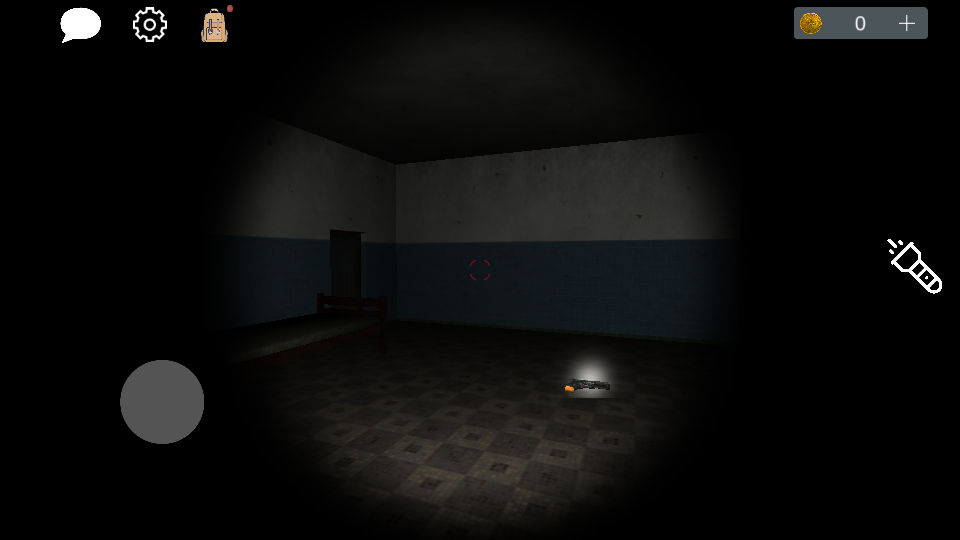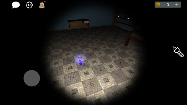 4、进入游戏,点击物品便可拾取,在初始状态,玩家拥有手电筒(可关闭),左上角分别是来聊天、设置、以及背包,用于游戏中收集线索道具;