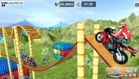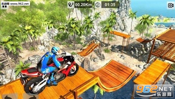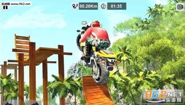 这是一款非常有趣的赛车特技比赛游戏。游戏中玩家扮演的是一名摩托车特技驾驶员,你拥有高超的特技驾驶技术。游戏中的赛道非常的有创意,赛道都是架设在空中,玩家一定要小心的驾驶,不然掉下去游戏就直接失败了。