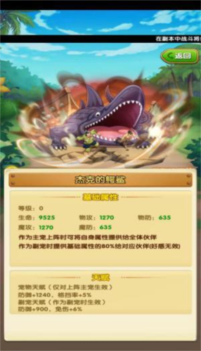 作为防御型金宠,鳄鲨主宠天赋提供5%格挡率+防御加成,副宠则附加6%免伤,特别适合格挡反击流阵容(如杰克、新世界山治、溪流等)。