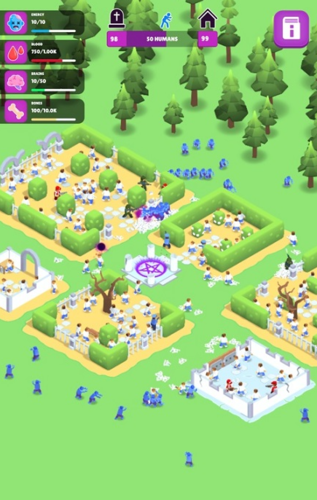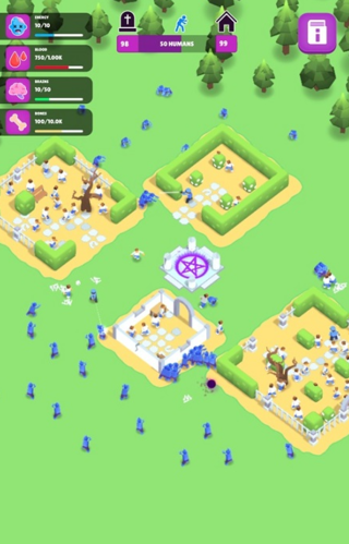 游戏围绕制造—收集—强化—扩张”的核心循环展开。首先,你需要不断生成僵尸,组建部落主动攻击人类;随后从被击败的人类身上收集血液、大脑与骨头等关键资源;利用这些材料升级僵尸属性,使其更快、更强、更持久;每个关卡设有时间限制,需在倒计时结束前完成目标;同时,建造骨槽可解锁并管理骨收集器,提升资源采集效率;而诅咒墓地则能在能量满格时自动产出僵尸,通过墓地”界面还能精细调控僵尸数量,实现自动化扩张。整个流程环环相扣,策略与效率并重,带来持续不断的成就感。