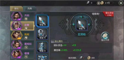在武将界面选择装备后,可消耗秘银进行强化。秘银主要通过讨伐世界流寇获得,是提升战力的关键资源。