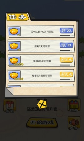 2、你闯过的关卡越多,自己的官职就会不断的上升,财富累计的速度也会加快;