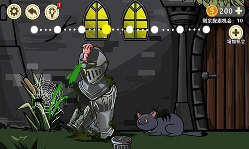 先点击垃圾桶,再选树枝引诱小虫入洞。随后依次激活红、蓝、黄、白四个按钮助其脱困。最后点击小猫,让虫体跳上其身,开启通往下一区域的大门。