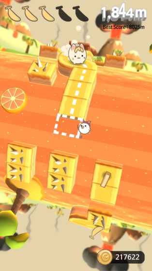 游戏玩法很简单就是让我们通过不同的手势动作来让猫跑的更远,途中有各种不一样的道路缺失了一部分或者一大截需要我们滑动手势来躲过它们,手势操作是什么呢?