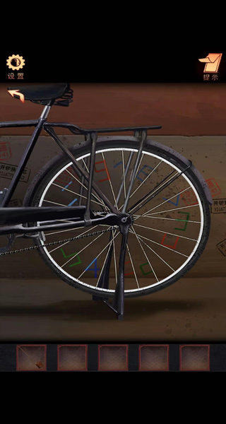 9、来到室外,点击电线杆后的自行车,通过转动车轮可以得到密码提示,红9蓝4绿3.根据这个提示打开墙上的邮箱,点击获得【磁铁】。