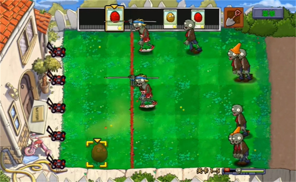 3、僵尸会从五条分路随机选择一条出现,右下方是当前关卡的进度条,旗帜位置代表会有一波强烈进攻。