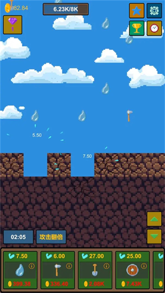 水滴石穿最新版是一款融合像素艺术与挂机放置玩法的休闲解压游戏。在游戏中,玩家将见证一滴滴水珠从天而降,精准击打下方的石头,每击中一次即可获得金币;随着石头被逐步击碎,收益也将大幅提升。所获金币可用于升级水滴威力或解锁多样道具,从而加速破坏进程、提升效率。无需复杂操作,轻松点击即可开启一段以柔克刚”的奇妙旅程——快来下载体验,让时间在水滴声中悄然转化为丰厚回报!