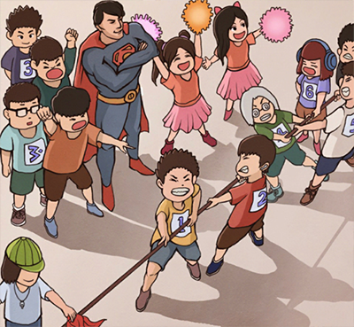 1、站在最前面的那个举着手指指着对面的学生的那个人,我们点击就好了。