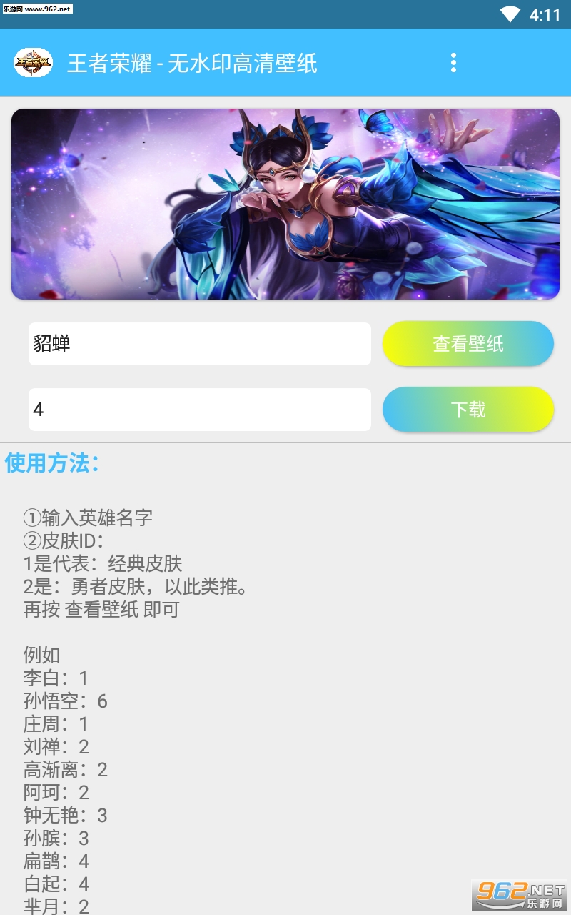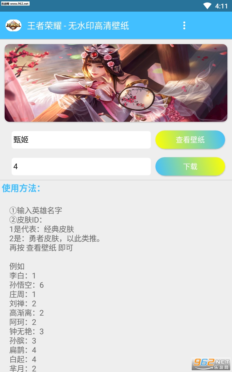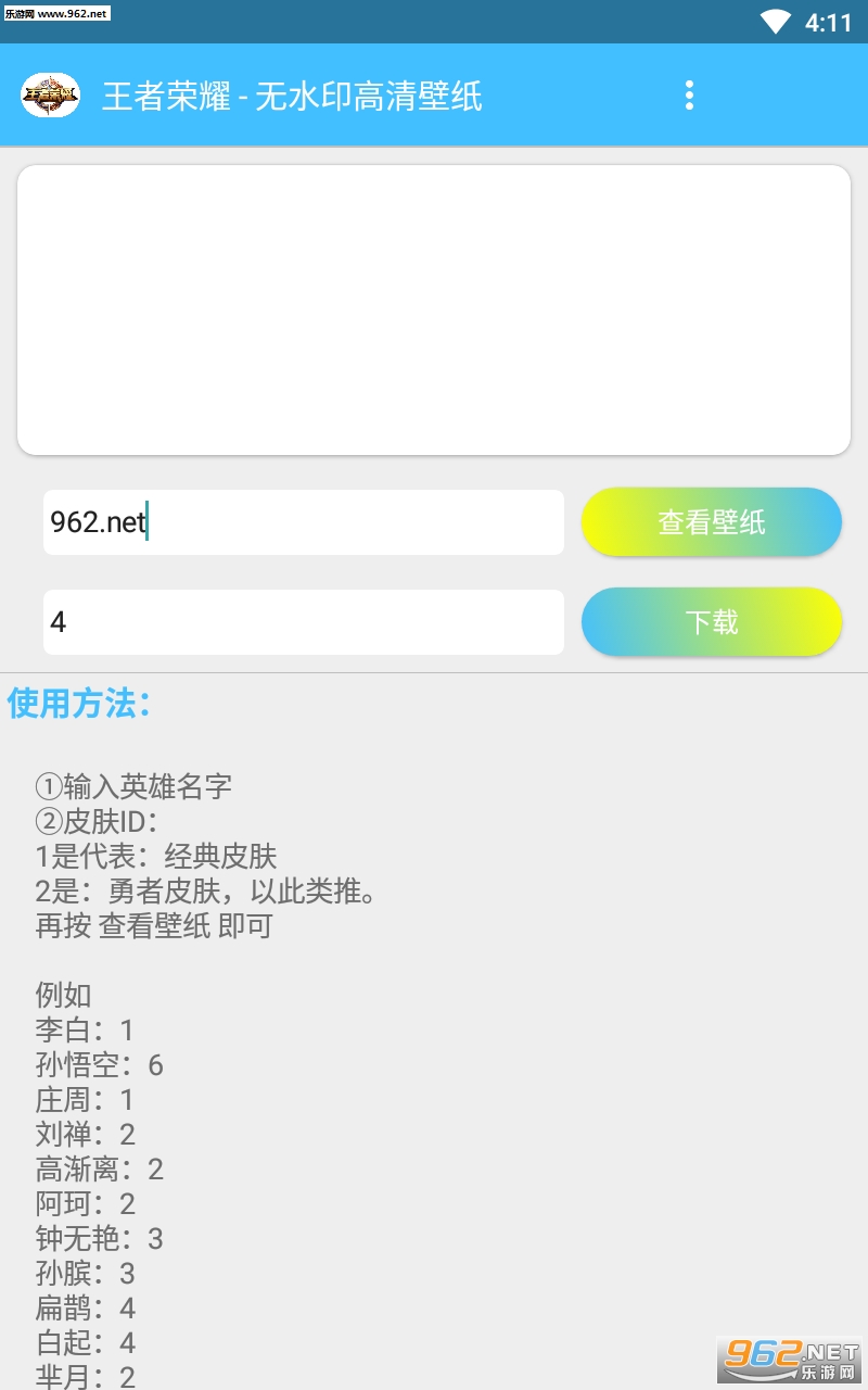 王者横向壁纸app是一款可以根据王者荣耀英雄皮肤的序号来获取高清壁纸,各个英雄的炫酷壁纸轻松获取下载保存。