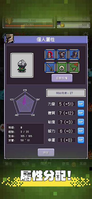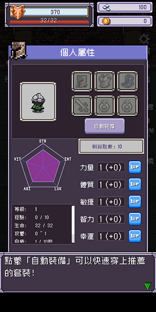 勇者大人的刷怪城是一款充满趣味的冒险闯关游戏,拥有简单易上手的操作方式和丰富多样的玩法内容。在游戏中,玩家将扮演一位前往地下城战斗的勇士,迎接各种挑战与冒险。为了能够成功击败敌人,玩家需要不断闯关获取奖励,强化装备,提升角色战斗力,并合理分配属性点,以发挥出最强的实力。