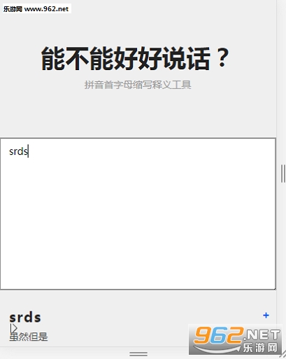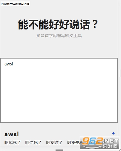 《能不能好好说话工具》是一款紧跟时下热点去翻译各种英文首字母的工具,比如说awsl阿伟死了,yysy有一说一等等,在你看一段文字看的完全一头雾水的时候可以尝试将这些英文单词放在工具里面来进行翻译,当然大概热门的词才能被翻译吧,否则就是未录入了,感兴趣的亲们可以来试试。