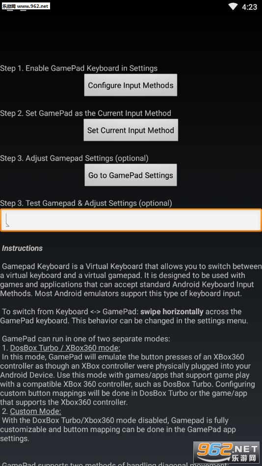 唯一100%免费的游戏键盘手柄模拟。模拟D-DPaddle方向alkey和光标键盘键,以及四个单独的按钮。 模拟游戏手柄NYOURCHONE。设计用于Dosbox Turbo,但可与Androider、OnLive、TopFlash和任何Android游戏一起使用/可作为输入法框架使用==8=true Android应用程序!