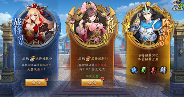武将可通过招募、商店、副本、活动等多种途径获得。其中招募系统分四大类型: