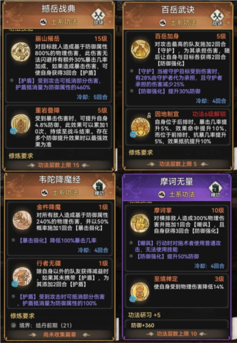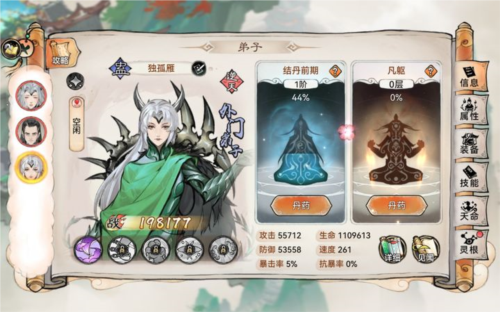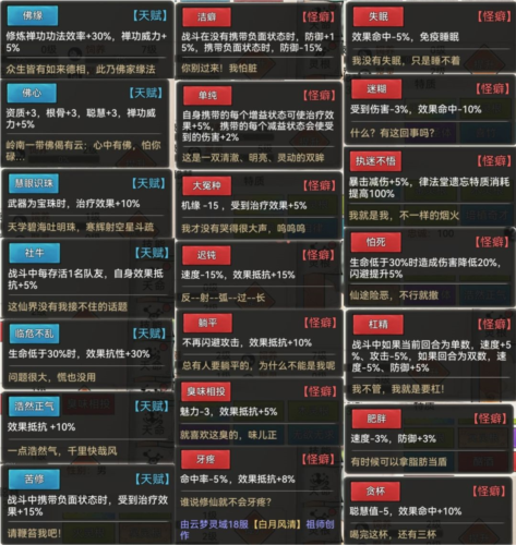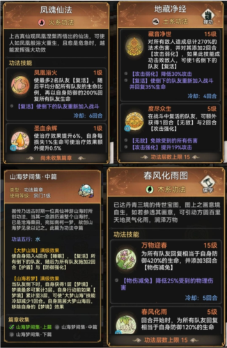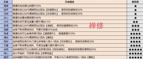 禅修:团队守护者,兼具复活、护盾与减伤。五行禅适配全系功法,核心天命为禅心”(首回合免疫控制)。推荐功法包括【凤魂仙法】(复活)、【地藏净经】(击败回血+无敌)、【春风化雨图】(高额回血)。词条注重防御与效果抵抗,杠精”洁癖”可叠加增益。