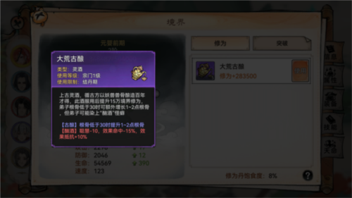 2. 服用灵丹/灵酒:消耗【修为丹】是快速提升的核心手段。丹药可通过【炼丹房】制作,主材为仙草与妖丹,高品质丹方可在坊市或仙盟商店获取。此外,探索世界地图可获得【猴儿酒】【琼华露】等稀有灵酿,但需注意酗酒”怪癖风险。