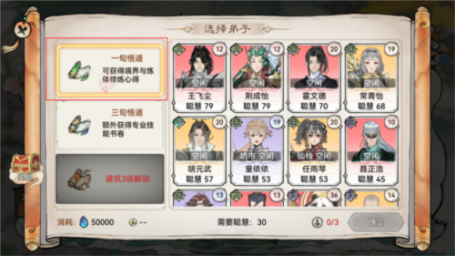 3. 研读修炼心得:逐出弟子或在【悟道堂】可获得【修炼心得】,研读后可提升修为且不增加饱食度,是后期高效养成的重要补充。