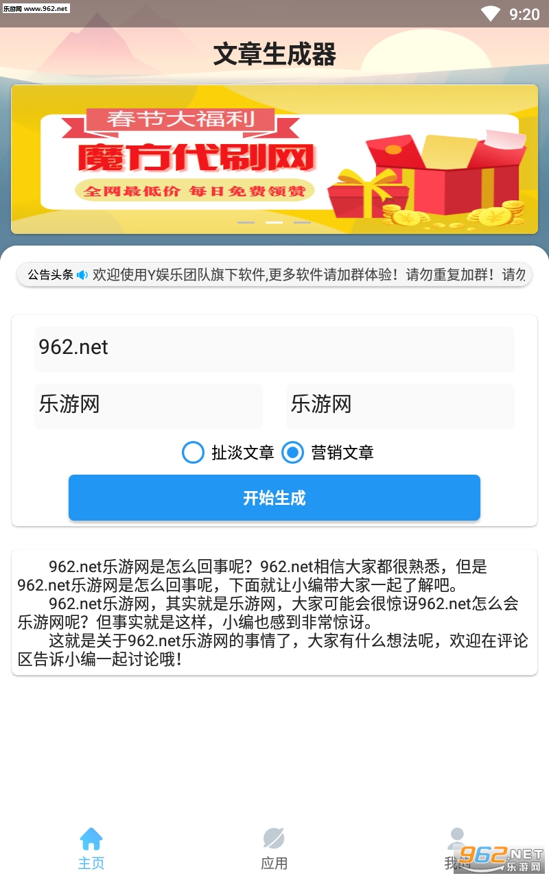 一款能够通过你输入的主题和附加内容一键生成扯淡文章和营销号文章的APP,软件集成了狗屁不通文章和各大营销号常见的套路文章,操作简单内容有趣,非常适合发说说、朋友圈。
