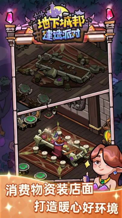 地下城邦建造派对是一款模拟经营类型的小游戏。玩家能够在其中自由的建造出各种不同的建筑物,让玩家们都可以在游戏中打造出专属于自己心目之中的完美城邦,大量化的游戏玩法也都能够在游戏中遇见到!超多的区域也都是能够在其中进行解锁的,装饰一下这一全新的地下城!