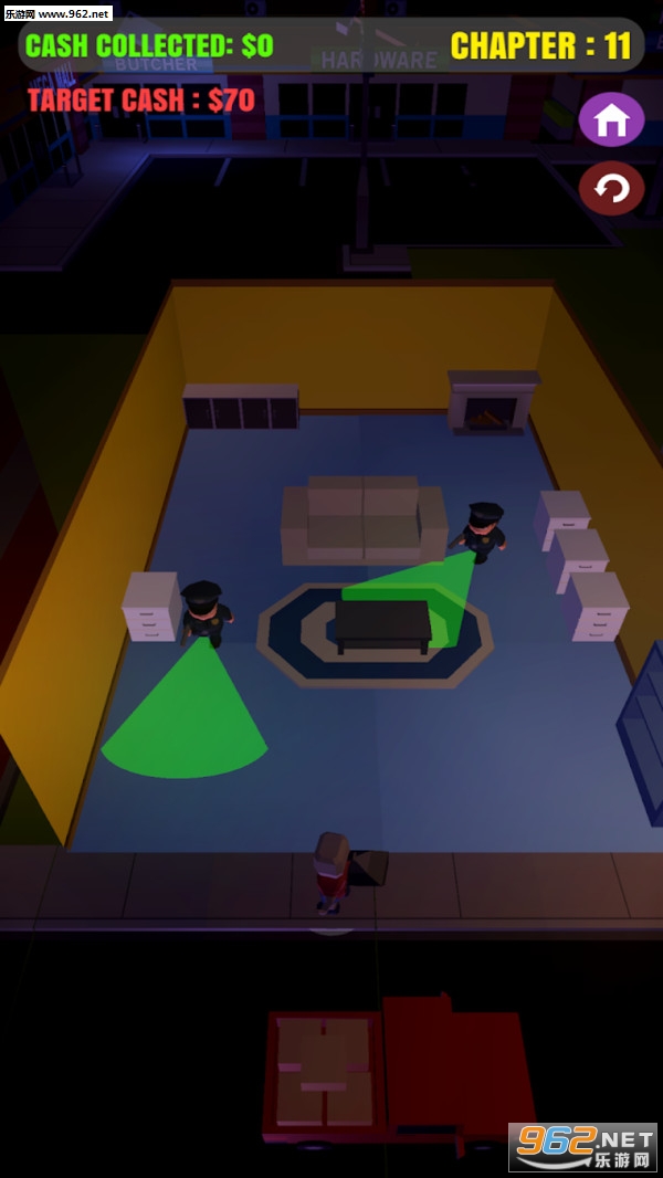 画面感的设计以休闲的卡通画风为主,在每一个密闭的环境内,如何巧妙的避开巡视的警卫偷到你的目标物品才是游戏的关键;