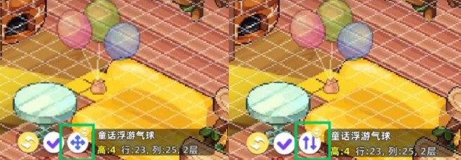 如下图绿色框体内,点击左侧第一个黄色按钮,大家可自由切换家具的朝向;摆放完成后可点击第二个紫色箭头按钮完成编辑;第三个蓝色方向箭头按钮可水平移动家具,点击同一个按钮切换为上下箭头时可更改家具所处层数。