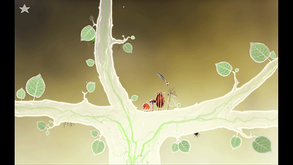 7、回到树枝分叉口,一直往右走到底会遇见两个坏蛋看守的最后一根羽毛,此时点击我们的树枝哥让他倒吊着去偷羽毛,完成任务。