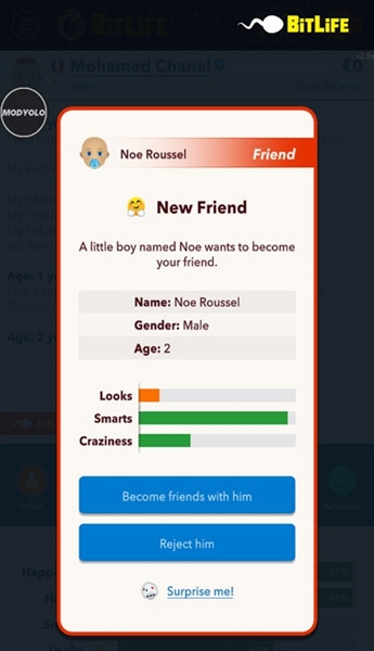 BitLife内置破解版是一款十分好玩的模拟细胞生命进程的一款游戏,游戏中玩家将会从婴儿时期开始进行游戏,接下来这一生的所有选择都将由你自己来做决定,只有你自己所做出行动和选择可以改变它们,会活出什么样的人生全部只看你。