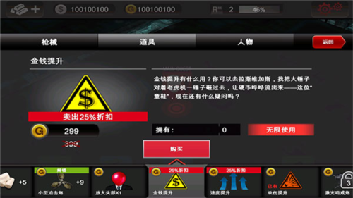 2、商店里出售主副武器,功能性物品,以及回血的绷带等,分为游戏币和金币两种购买方式,随着等级的提升,会解锁更高级的枪支以及装备物品。