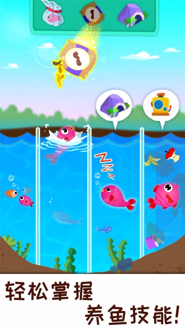 午饭时间到!宝宝准备茅草、鱼食等饲料,前往牛棚、鱼塘、鸡窝、羊圈,喂养动物们吧。大奶牛还想喝水,宝宝把水盆端到它面前;母鸡的食欲好像不错,宝宝再倒点鸡饲料。