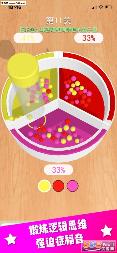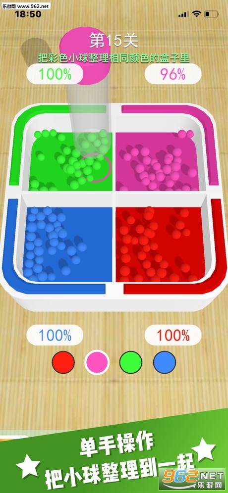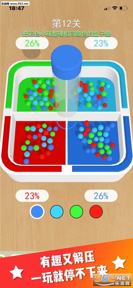 趣味的分类游戏,玩家需要将这些散乱的小球拾取出来,将形同颜色的小球放在同一个区域,没有什么难度,主要是打发时间,比价解压。