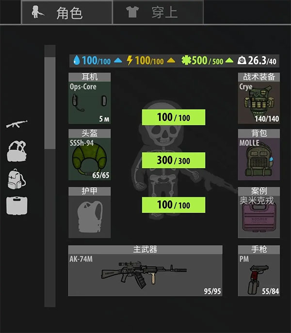 全副武装:(耳机、头盔、战术背心、背包、主副武器、备用弹匣、医疗用品、食物)