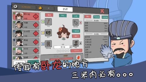 在《有卧龙的地方必有》中,你将亲历一场别开生面的三国冒险。游戏采用Q版卡通风格,既保留了历史人物的辨识度,又赋予角色鲜活灵动的个性。作为初出茅庐的主公,你需要通过招募武将、培养谋士、排兵布阵,逐步壮大自己的势力。每一场战斗都考验你的战术思维,每一个决策都可能改变乱世格局。
