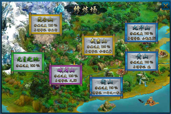 名山修炼策略:七大名山(峨眉、昆仑等)提供不同等级的修炼加成,其中峨眉、昆仑基础加成达20%。帮派占领后可进一步提升收益,但需支付挂机费用。玩家还可通过抢夺修炼位、使用护法弟子或仙府禁法保护自身,策略博弈贯穿始终。